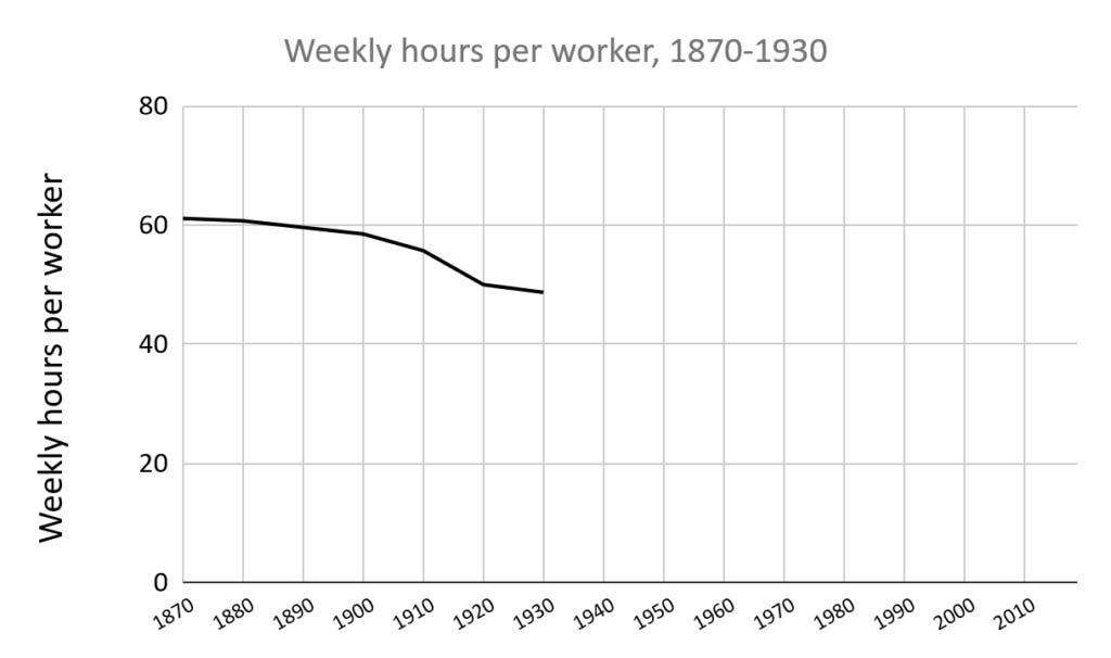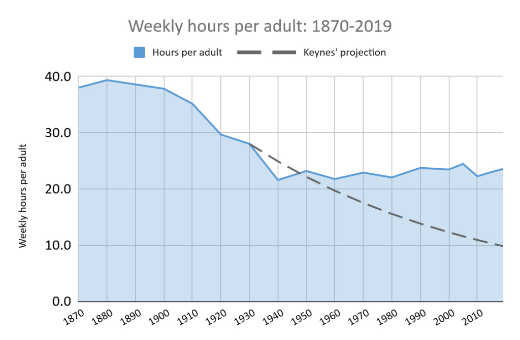 Keynes was roughly right for the first 10 years, and not too far off even as late as 1980 when weekly hours hit a low of 37.9. But they have plateaued ever since.