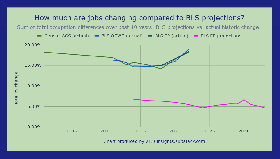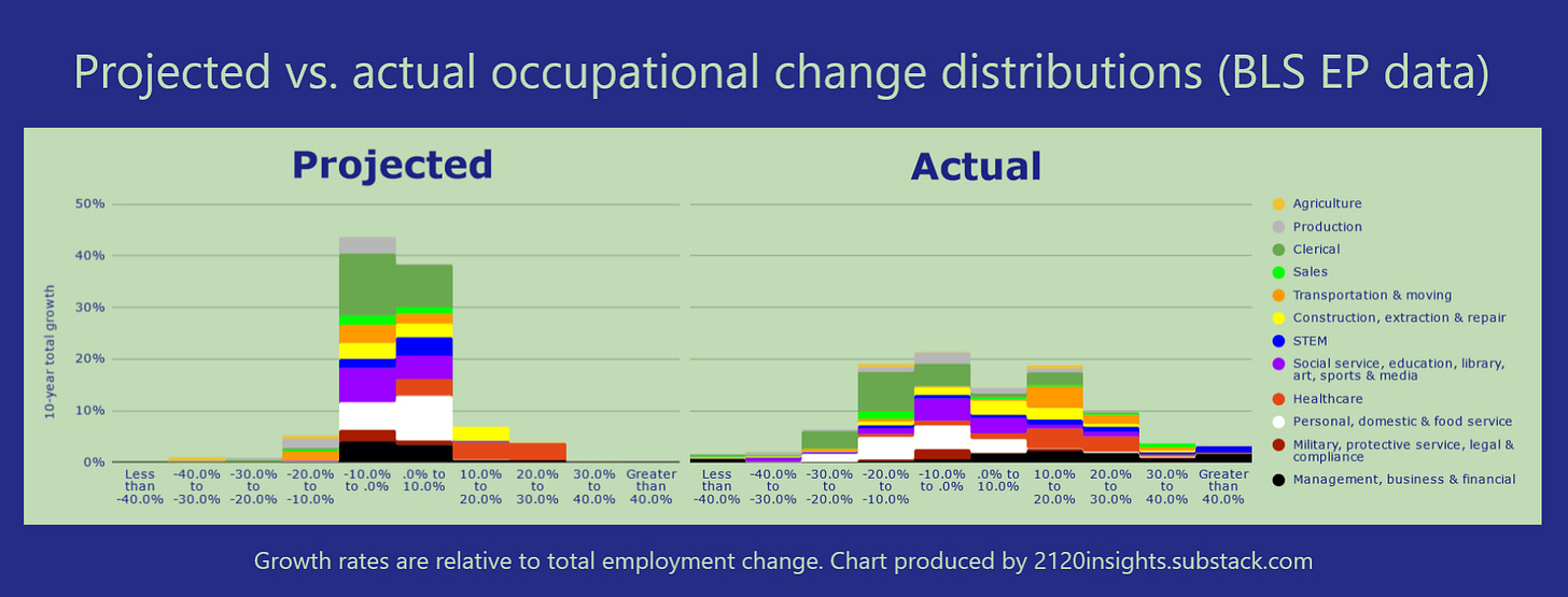 Of course, this doesn’t mean that we should just assume little change out of an abundance of caution, or that it is impossible to predict with any accuracy where jobs will grow or decline next. Indeed, a key flaw in BLS occupational projections is that they are far too conservative! I have alluded to this in some of my previous work, but I’ve finally done a more complete analysis here. If we imagine how much occupational change the BLS forecasts estimate vs. how much happened historically, we see that their forecasts only capture about one third of the actual change (and possibly less heading into the 2020s).