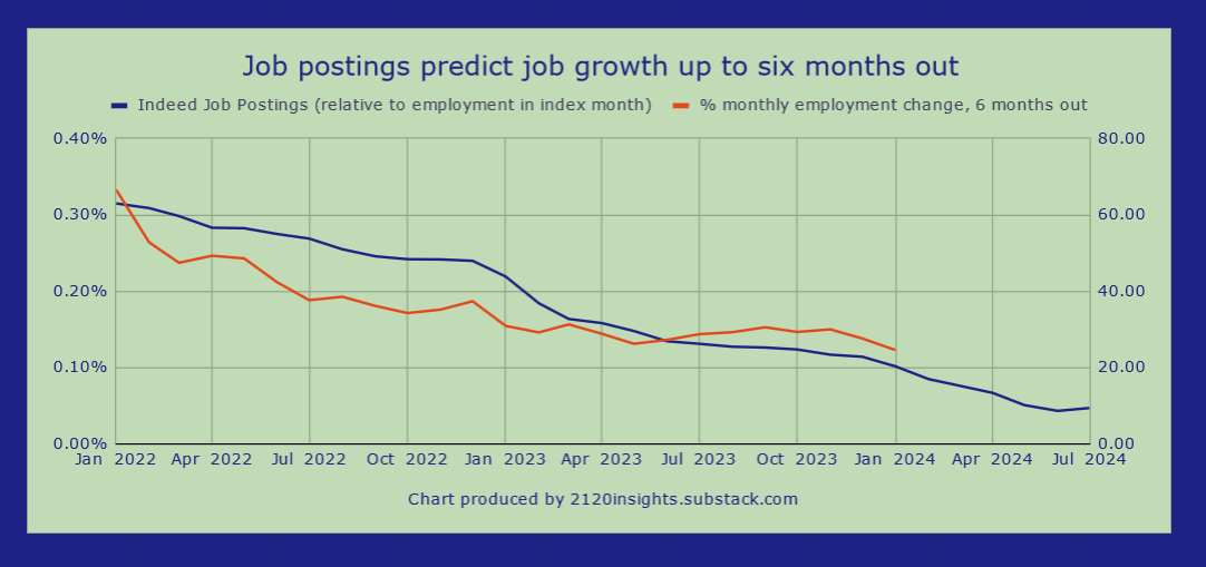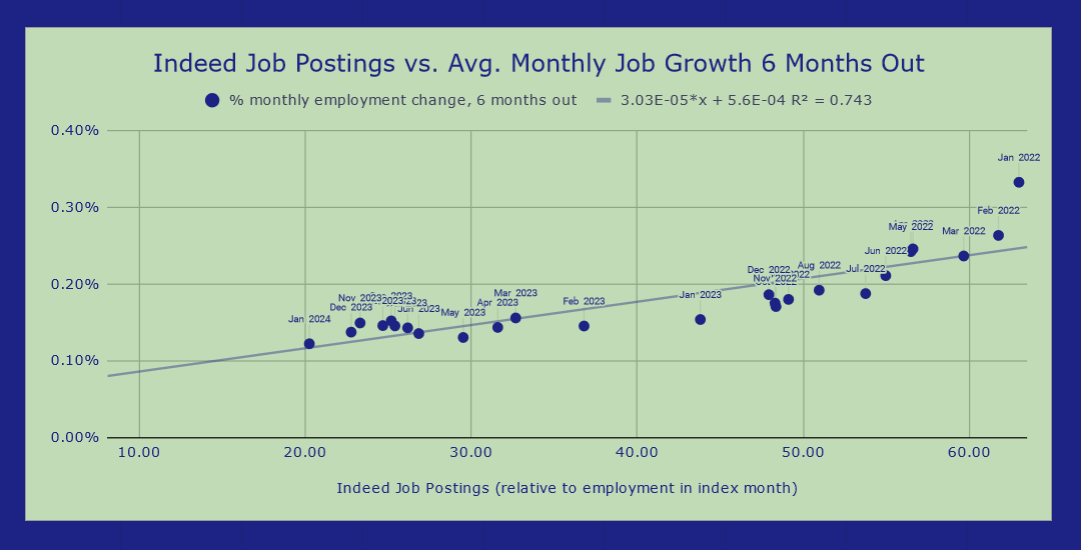 While there are some worries about fake job postings distorting the average, it has been a good leading indicator of the number of job openings reported by JOLTS these past few years. And even more importantly, since 2022, the level of job postings1 on Indeed has reliably forecasted employment growth 6 months out!