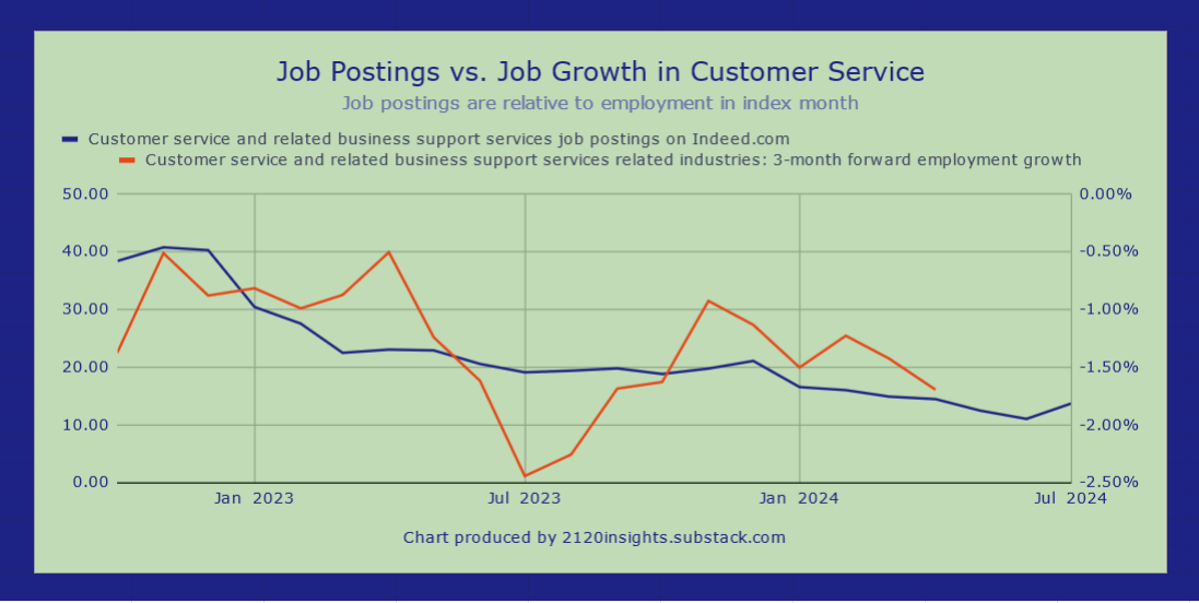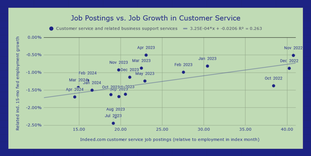 That we can with some reliability see a few months into the future of dozens of broad occupational groups might give us some clues into early signs of AI and other technologies that are disrupting work. With some companies claiming that their customer service chatbots are already handling the work of hundreds of employees, can we see this trend in Indeed’s customer service job postings?