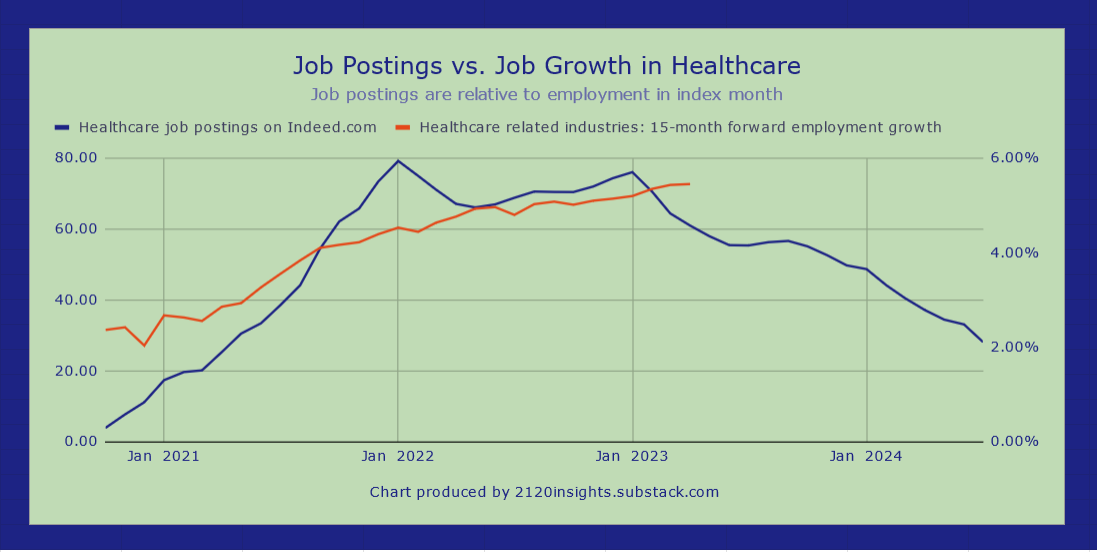 One of the strongest and most forward-looking correlations has been between the level of job postings in healthcare and growth in healthcare-related industries. These closely tracked each other from October 2020 to early 2023, but we are are now at a critical juncture: if the level of healthcare job postings from 15 months ago is still indicative of today’s employment trends (presumably due to longer hiring timelines in this industry), we should see job growth in healthcare-related industries cooling off very soon.