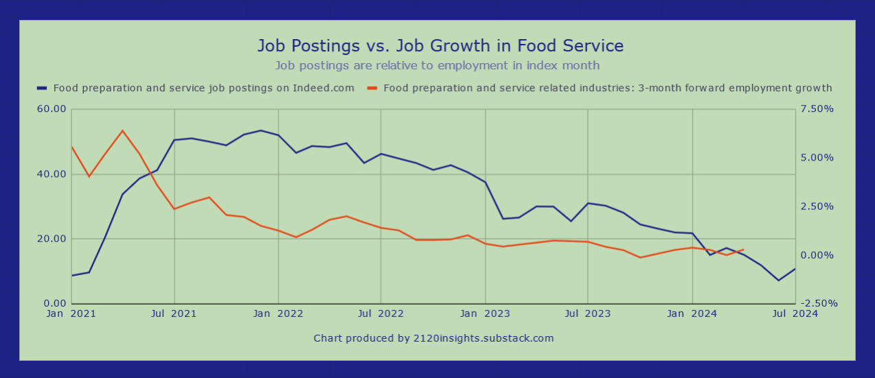 If this indicator isn’t getting the attention it deserves, it may be because of its history. It is a fairly new one, which wasn’t published until February 2020, which was… rather unfortunate timing. While it remained a good signal of how much interest there was in hiring throughout the pandemic, the course of the pandemic was much more indicative of how the actual job numbers would change in future months. Even during the recovery in 2021 and early 2022, so many workers quit during the Great Resignation that the number of job openings went up even as growth in employment fell in some sectors. The food service sector is a great example of how the relationship between job postings and employment growth can actually reverse itself in a very hot labor market.