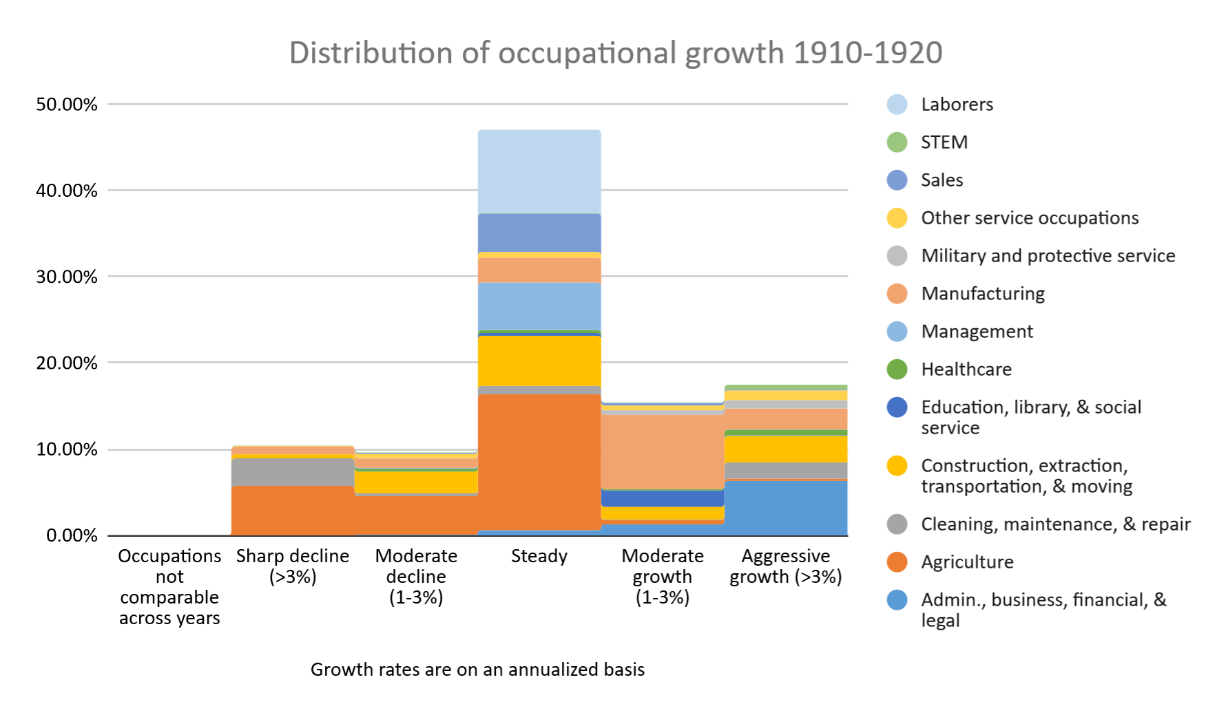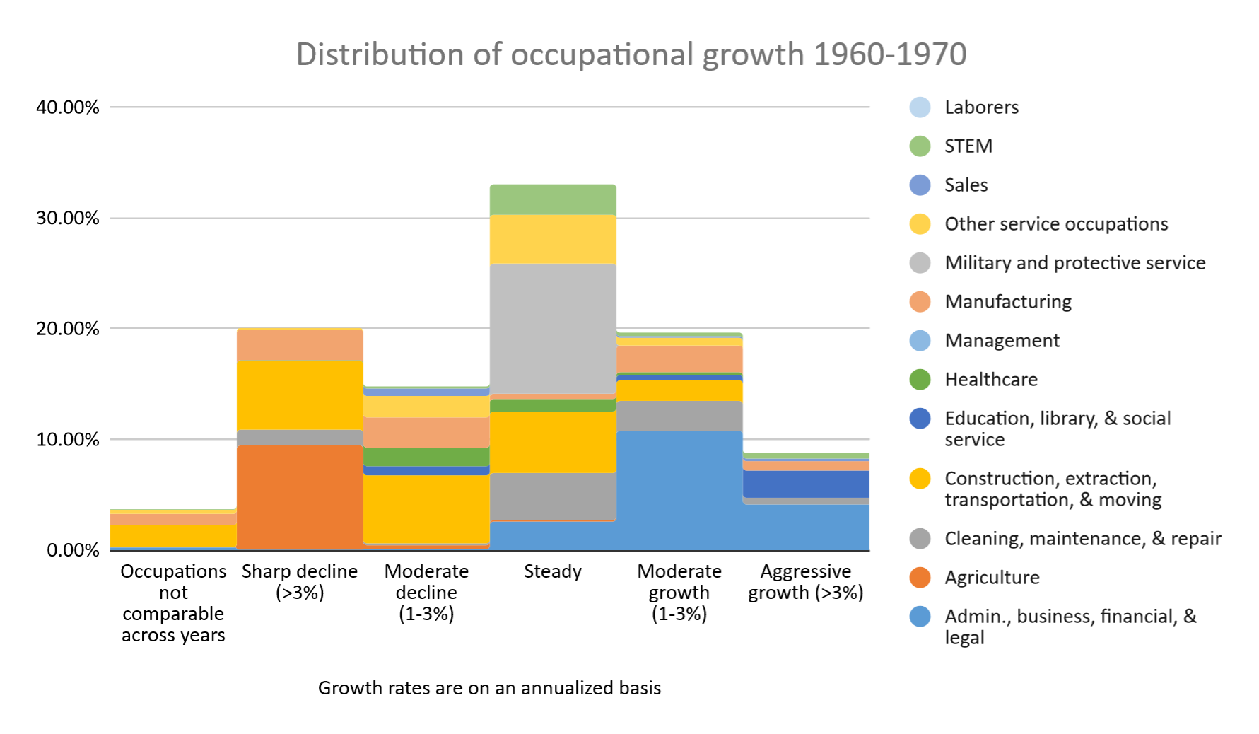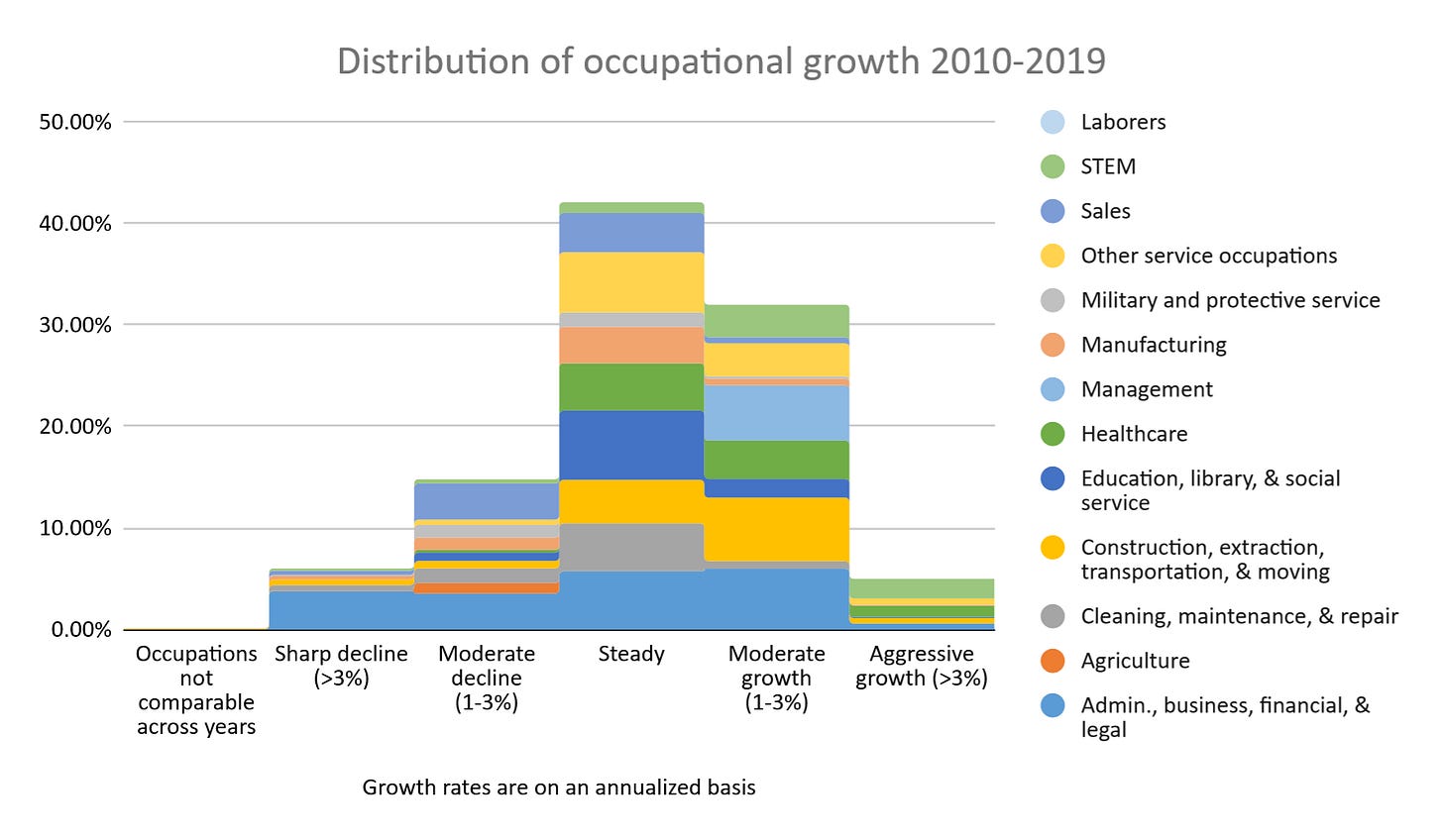 The 2010s, like most prosperous decades during peacetime looked like a pretty normal bell curve, with a little bit of a skew to the right. Since we are looking at growth relative to all job growth, everything should average out to zero. So, seeing more jobs in “moderate growth” than “moderate decline” suggests that the few jobs that are declining are dropping more quickly relative to their category (i.e. a heavier “tail” to the left).