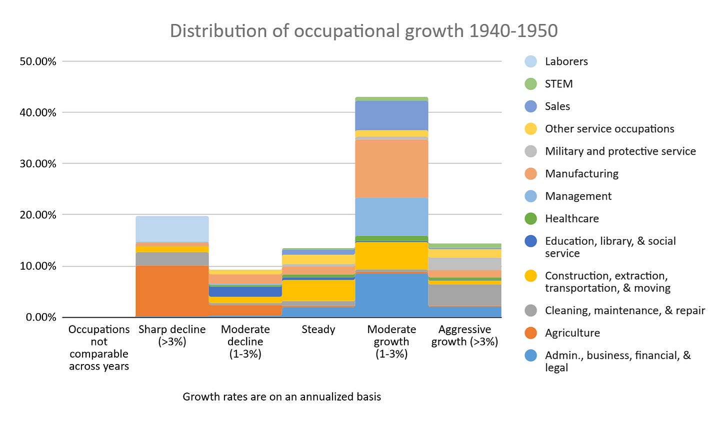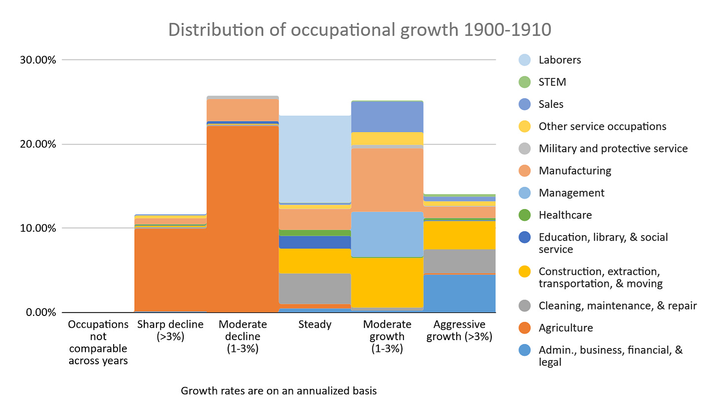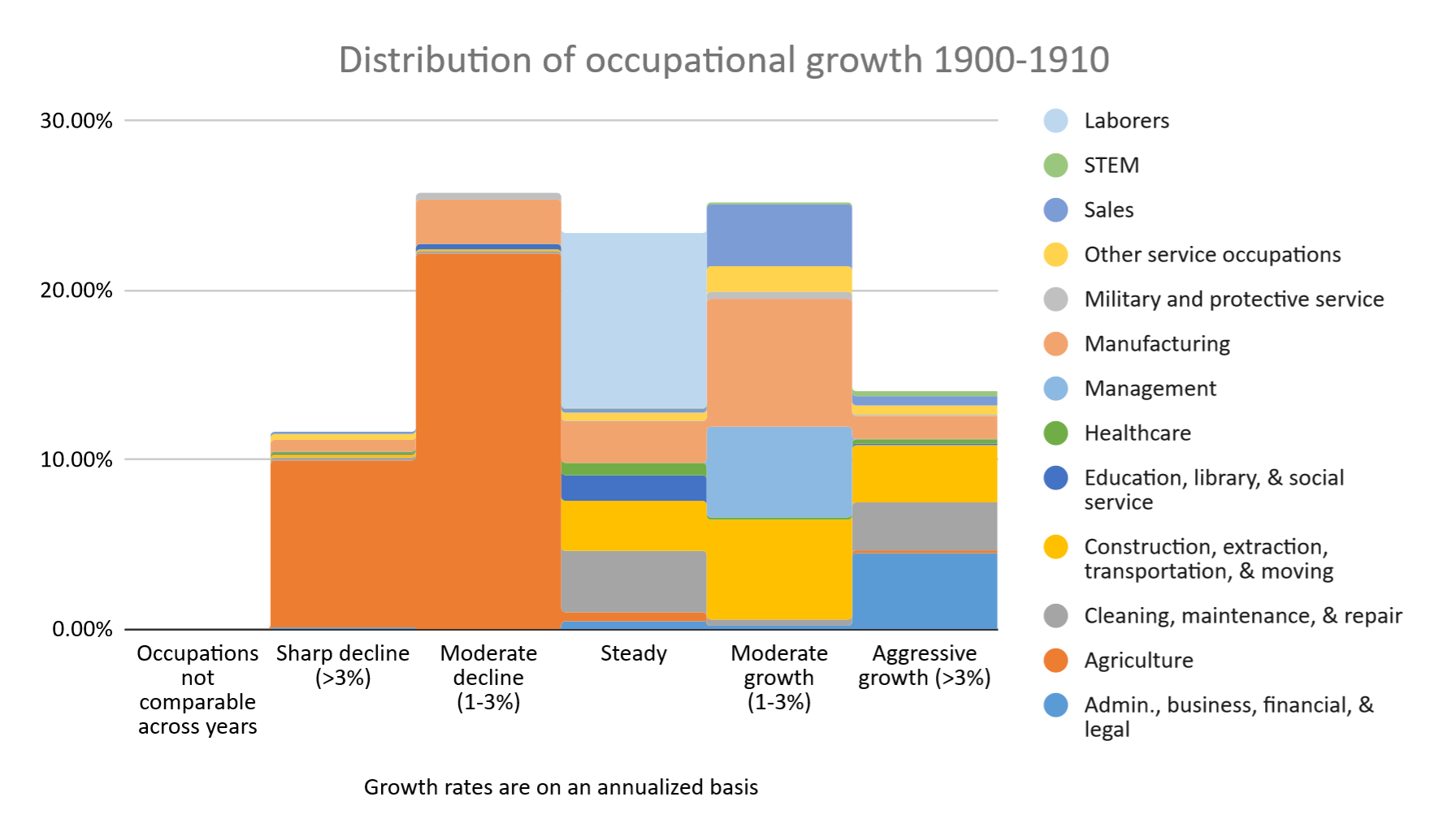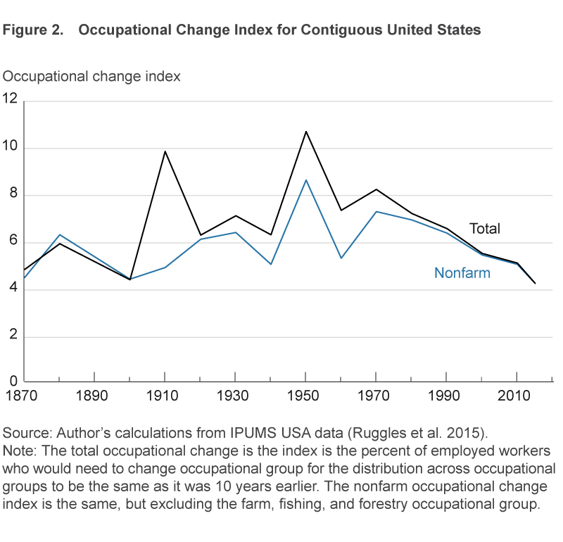 We can get somewhat of a sense of how quickly occupations are shifting over time from these, and indeed Joel Elvery at the Cleveland Fed did an analysis concluding that the fastest turnover in terms of types of jobs happened during the 1900s and 1940s. According to this analysis, turnover in the 2010s was historically low.