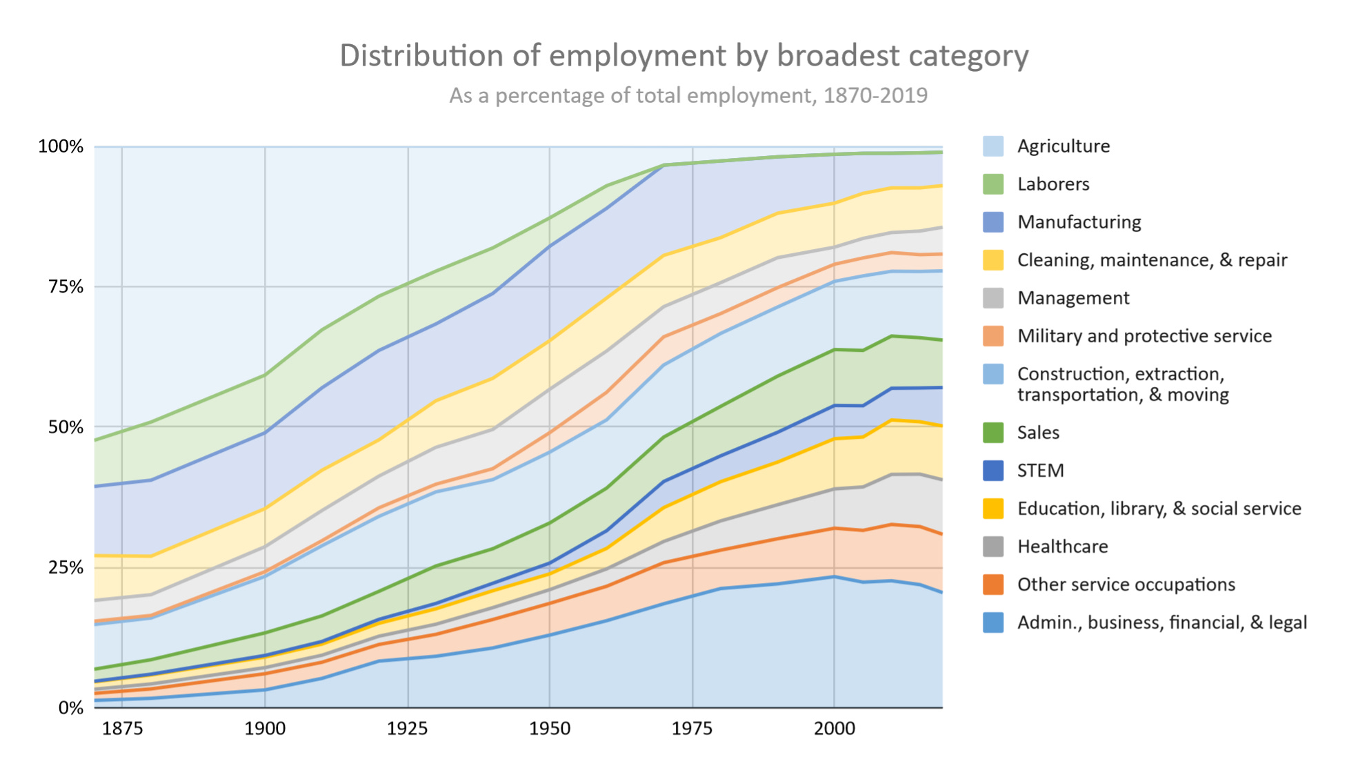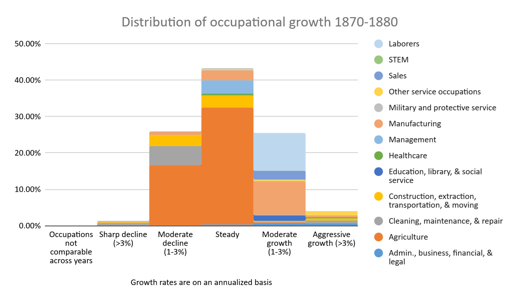 Remarkably we see this same pattern as far back as the 1870s, though with a lot more agricultural jobs and fewer extremes:
