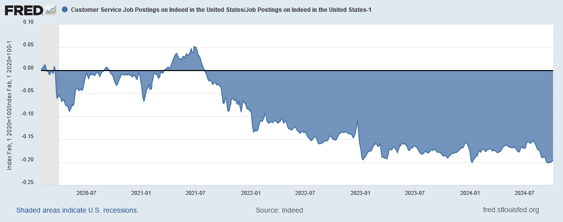 This dramatic downturn in customer service representatives is already visible in Indeed.com job openings data, which has proven itself to be a moderately reliable forecaster of employment in this sector. Openings are down over 20% relative to the job market as a whole since early 2022 and continue to drop.