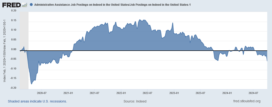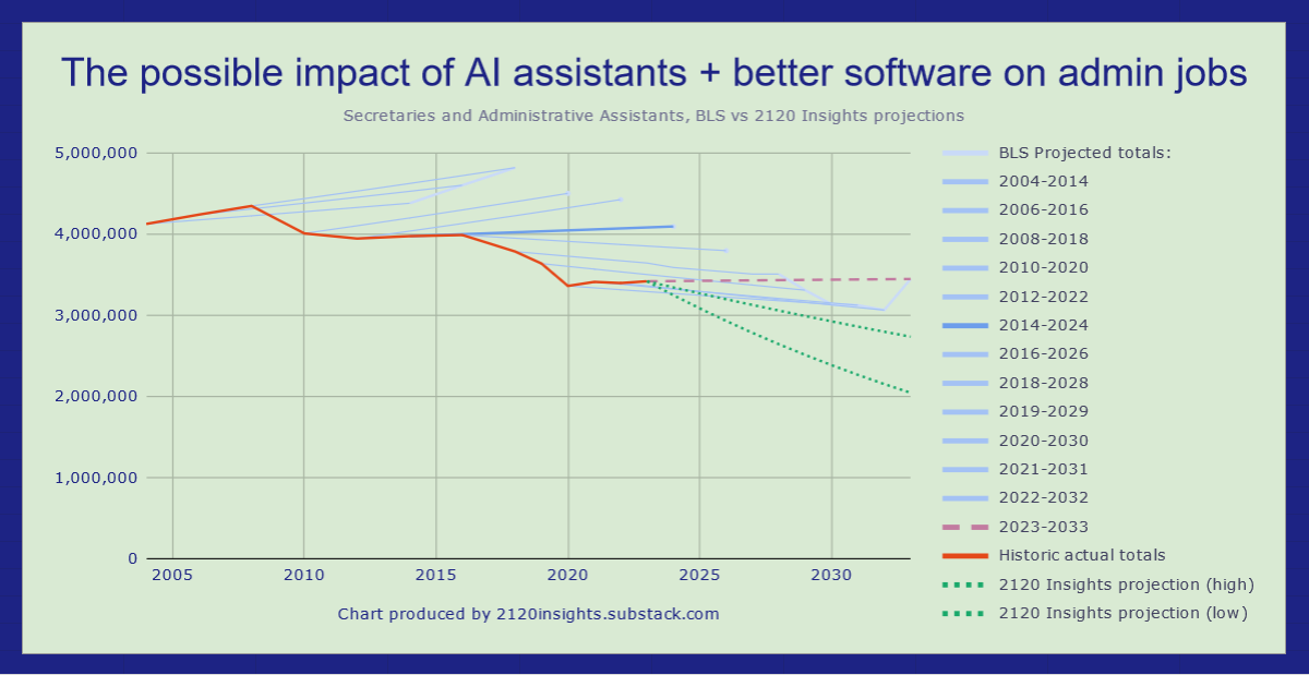 That trend appears to be over though. October 2024 has started with another ominous drop in job openings in this field, and I suspect as a base case that we will return to the familiar decline in administrative work we’ve seen since the 1980s—at least another 20% drop, but possibly as high as 40% by 2033.