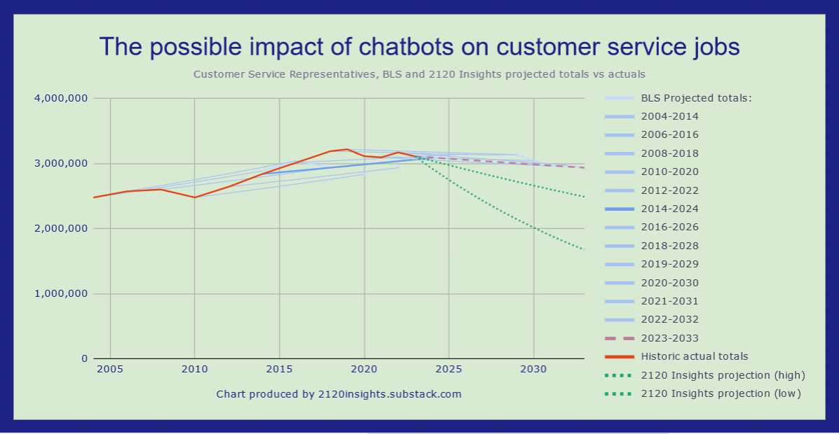 Whether this same demand for US-based, human customer service workers will still be there in the 2030s is the key question. On one hand, 2023 BLS projections note that growth in healthcare is likely to continue due to “federal payment models emphasizing patient satisfaction”. But better software (which AI is likely to make cheaper) could also reduce the need for customer assistance, even in highly regulated industries and government where the adoption of labor-replacing chatbots and other AI-powered technologies might be slower.