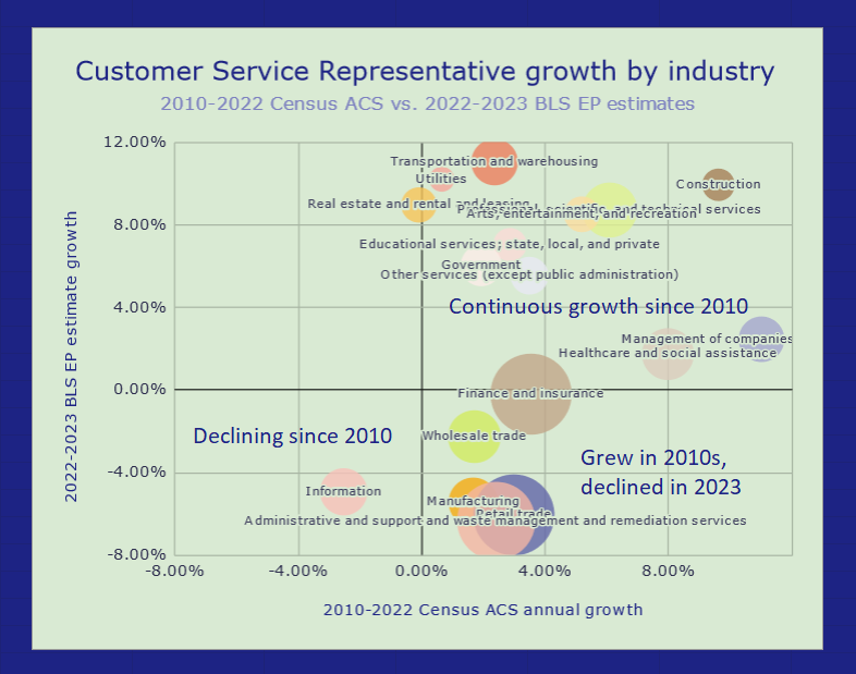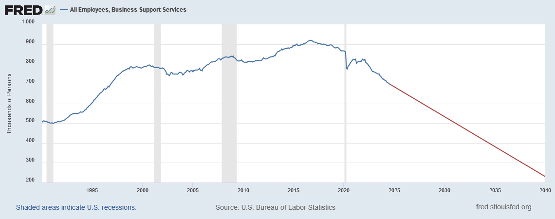 Losing this many customer service jobs across the entire economy within the next year or two would be a nightmare scenario affecting two million Americans and would bring up unemployment by a whole percentage point on its own. Fortunately, change this fast across an entire occupation would be entirely without precedent and is extremely unlikely to occur so quickly. But the recent 5-6% annual losses in the business support services industry2 suggest it’s possible that we could get there sometime in the 2030s.