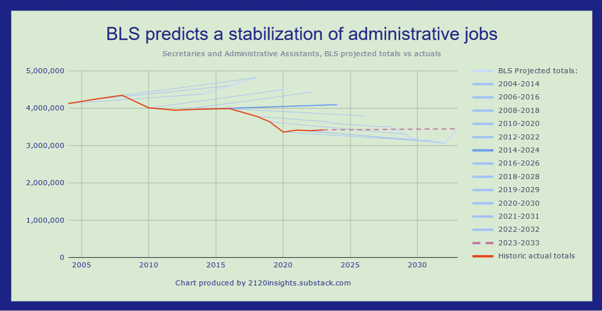 I think this is wrong. But I can understand why they were optimistic. From 2020 to 2023, the number of secretaries actually held steady, breaking the ominous trend that was apparent in this job in the late 2010s.