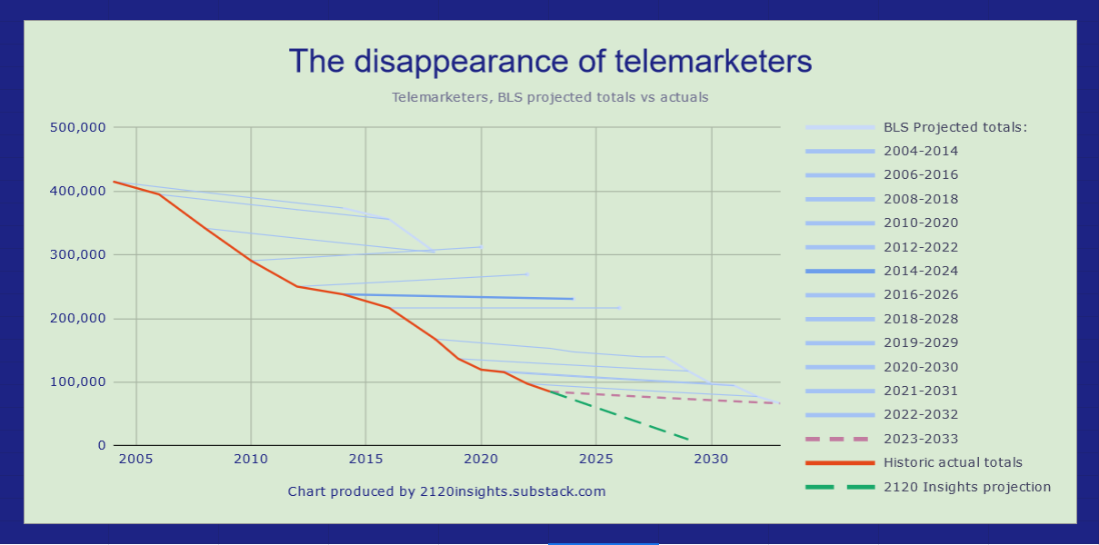 Of course, I doubt there are many people out there who consider telemarketing to be their calling. It is one of the least satisfying jobs out there. I’d be shocked if 66,800 Americans were still working in this field in 2033 as the BLS projects, given the historic trajectory. Even in 2020, only 19% of Americans answered unknown callers, a number that has surely dropped since then.